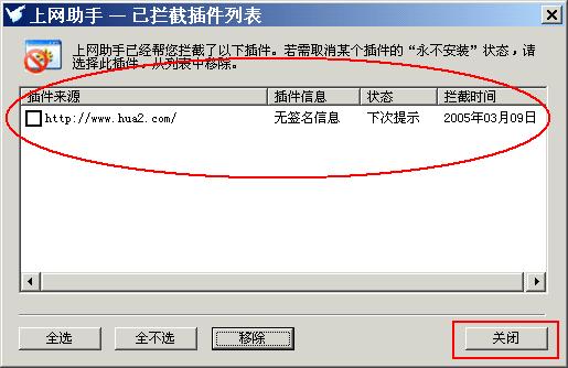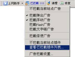 第一步:所有被上网助手拦截过的插件都被忠实记录,点击上网助手工具条中的“查看已拦截插件列表”即可了解所有被拦截插件的信息和拦截状态。如图所示: