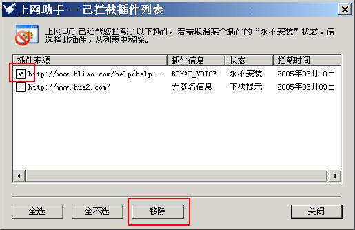 第二步:在3721上网助手的“已拦截插件列表”中,选中碧聊语音插件,然后再点击“移除”。如图所示:
